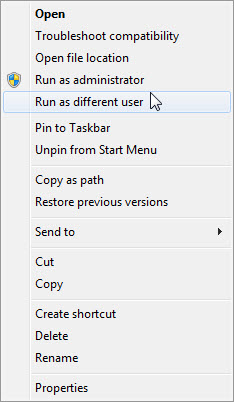 Open command prompt, type in runas followed by username and path to the application and hit enter.  You will be prompted for password